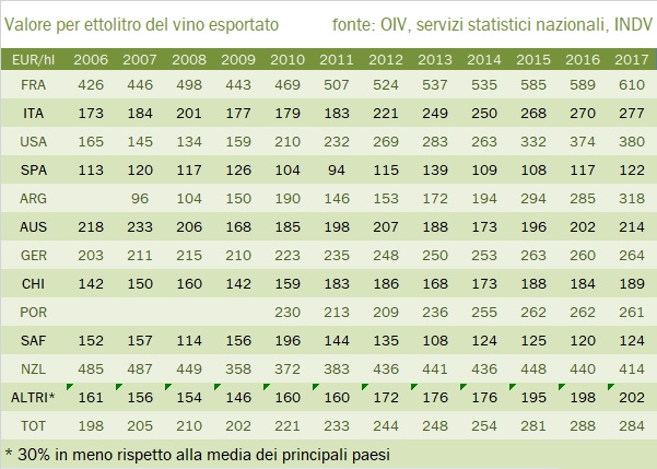 - Con una produzione di 250m/hl circa e un prezzo medio di esportazione di circa 290 euro per ettolitro, calcoliamo che il valore della produzione mondiale di vino 2017 sia nell’intorno di 72 miliardi di euro, o 82 miliardi di dollari.