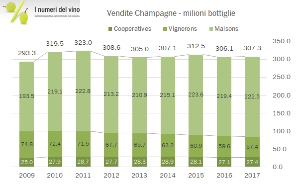 - Le spedizioni di Champagne nel 2017 sono state stabili a 307 milioni di bottiglie, con un valore di 4.9 miliardi di euro, invece in crescita del 3%. Le maison sono cresciute dell’1% a 207 milioni, così come le cooperative, mentre i vigneron hanno perso il 4% a 57.4 milioni di bottiglie. Nel giro di 10 anni sono passati dal 23% a meno del 19% delle spedizioni, a vantaggio delle maison che oggi rappresentano il 72% del mercato.