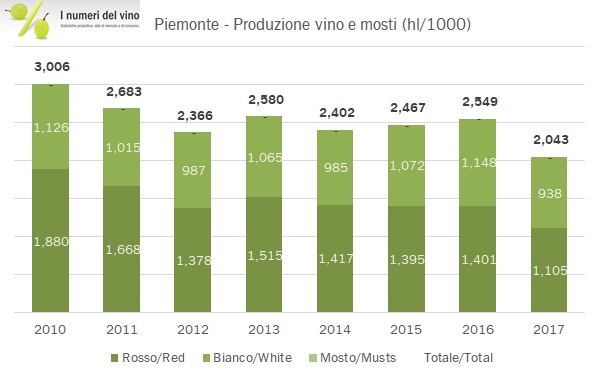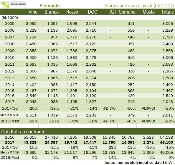 • La produzione di vino 2017 in Piemonte è stata di 2.04 milioni di ettolitri, in calo del 20% sul 2016 e del 22% sotto la media decennale di 2.6 milioni.