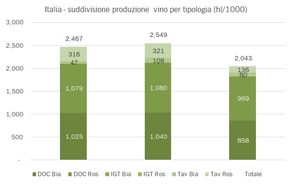 • I vini DOC a 1.83 milioni di ettolitri sono in calo del 14% e del 18% sotto la media (con un calo più accentuato nei vini bianchi che in quelli rossi), mentre i vini da tavola (in Piemonte non ci sono IGT) sono dimezzati a 216mila ettolitri, -43% rispetto alla media storica, con un calo più accentuato nel segmento dei rossi.