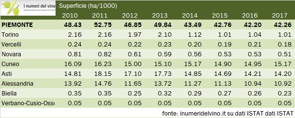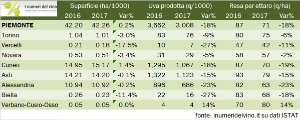 • Da un punto di vista provinciale, la produzione di uva 2017 è stata in calo del 15% a Asti, 1.12 milioni di quintali, del 18% a Cuneo a 1.07 e del 23% ad Alessandria, scesa sotto 0.7 milioni di quintali.