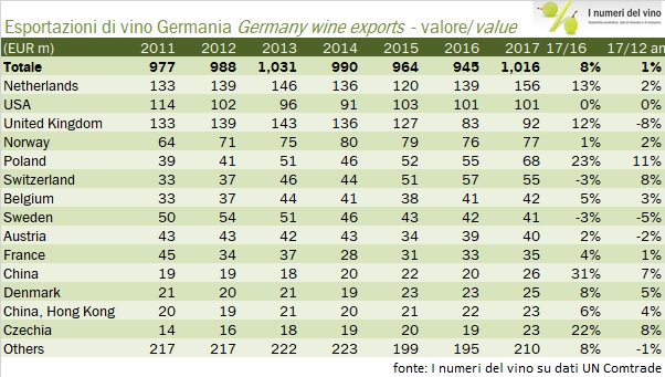 - Le esportazioni tedeschi di vino sono cresciute dell’8% a 1016 milioni nel 2017, con un volume esportato di 3.84 milioni di ettolitri, +6% e un prezzo medio di esportazione di 264 euro per ettolitri, in crescita dell’1%.