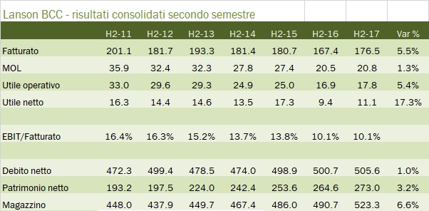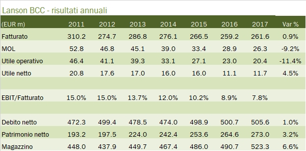 • Con ammortamenti stabili, sotto l’utile operativo (20 milioni, -11%, margine del 7.7%) Lanson beneficia di oneri finanziari in calo per via del citato rifinanziamento e un’aliquota fiscale che scende dal 32% al 29%, consentendo quindi di “salvare” l’utile netto, rimasto nell’intorno di 12 milioni di euro, addirittura in crescita del 5% sul 2016.