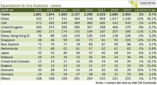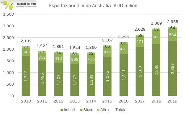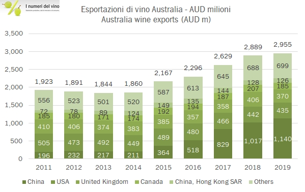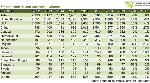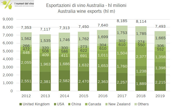 - Le esportazioni australiane sono cresciute del 2% nel 2019 a 2.96 miliardi di dollari australiani, nonostante un calo dei volumi dell’8% a 7.5 milioni di ettolitri (proprio dovuto a un crollo di volumi presumibilmente a basso costo spediti in Cina), dopo due anni di “super export” a 8.1 milioni.