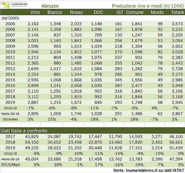 • La produzione di vino 2019 è stata di 2.89 milioni di ettolitri, cui si aggiungono 58mila ettolitri di mosto. In totale l’Abruzzo rappresenta il 6% della produzione di vino italiana, l’8% nel segmento dei vini rossi e il 10% dei vini da tavola. Più limitata la rappresentatività nel segmento dei vini DOC, soltanto il 4% nonostante Montepulciano e Trebbiano d’Abruzzo siano tra le più rilevanti denominazioni italiane.