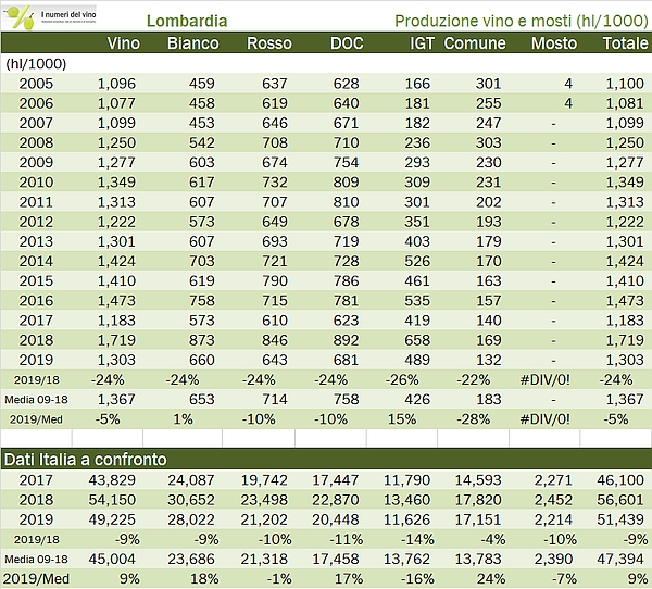 ISTAT ha rilevato una produzione di vino in forte calo nel 2019 in Lombardia a 1.3 milioni di ettolitri. Il dato si confronta con un 2018 eccezionale nella regione (1.7 milioni di ettolitri) ma è comunque circa il 5% sotto la media storica. Va ricordato che la Lombardia è una delle regioni dove la produzione vinicola ha mostrato negli ultimi anni uno sviluppo costante, determinato dalla crescente focalizzazione sui vini di qualità bianchi (Franciacorta) e da una graduale sostituzione di vini da tavola con vini IGT. La produzione resta per oltre il 50% nella categoria dei vini DOC e per l’85% realizzata in due province: Pavia e Brescia. Passiamo all’analisi dei dati.