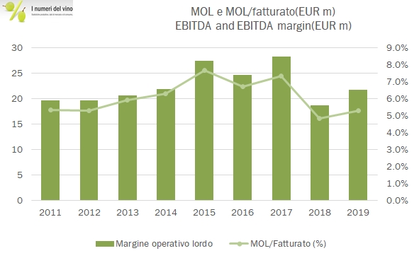 - Le vendite salgono a 409 milioni di euro, +5%, con un incremento dell’1% in Italia a 99 milioni (dopo 3 anni molto positivi) e un +7% nei mercati esteri. Abbiamo già detto del nuovo contratto di distribuzione (oltre che il riacquisto dei marchi Bolla e Fontana Candida nel mercato), che ha portato la controllata americana di GIV da 116 a 149 milioni di dollari di vendite, quindi +33 milioni di dollari e circa +30 milioni di euro di fatturato. Si confrontano con +21 milioni di euro a livello consolidato, lasciando ipotizzare che senza questa operazione “straordinaria” rispetto al passato avremmo commentato dei numeri molto meno positivi.