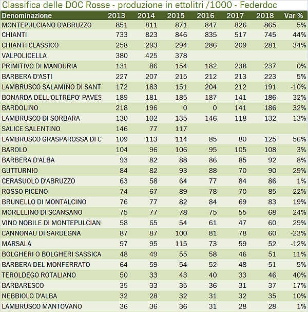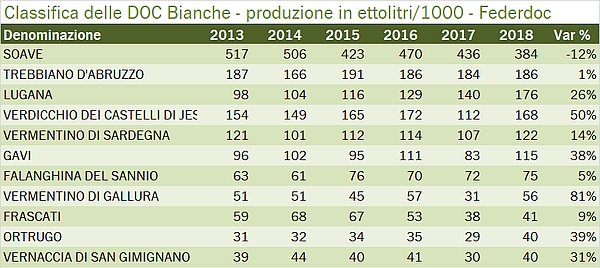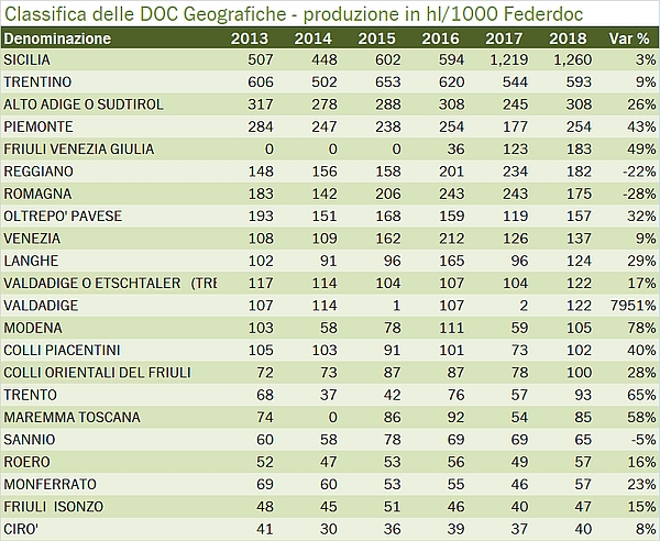 Quindi qui trovate una serie di classifiche relative alla produzione di vini DOC 2018. Ci sono un po’ di buchi, ma il 2018 è un po’ meglio della base dati 2017. Trovate anche tutti i dati nella sezione solonumeri del blog, in questo caso divisi per regione.