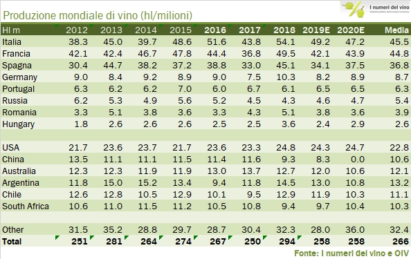 - Secondo OIV la produzione mondiale di vino si è attestata tra 254 e 262 milioni di ettolitri, contro un dato rilevato da OIV di 256 milioni e una stima leggermente più alta messa qui nel post di 258 milioni, relativa al dato italiano, che noi sostituiamo con le rilevazioni ISTAT.