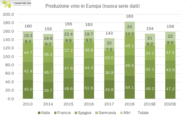 - L’Italia resta il principale produttore con una stima di 47.2 milioni di ettolitri, in leggero calo (OIV rilevava 47.5 per l’anno precedente), mentre sia per Francia che per Spagna si rileva un leggero incremento, 4% e 10% rispettivamente.