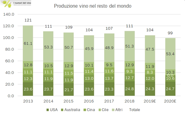 - La produzione mondiale si dividerebbe dunque tra circa 159 milioni di ettolitri prodotti in Europa e 99 nel resto del mondo. Proprio questa quota è quella in calo più significativo, giù del 5% (contro il +3% dell’Europa), a fronte di una vendemmia particolarmente negativa in Sud America e Australia: in Cile e Argentina la produzione cala a meno di 11 milioni di hl, giù del 13% e del 17% rispettivamente. Anche l’Australia scende del 12% a 10.6 milioni di hl, un livello non più registrato dalla grande siccità del 2007.