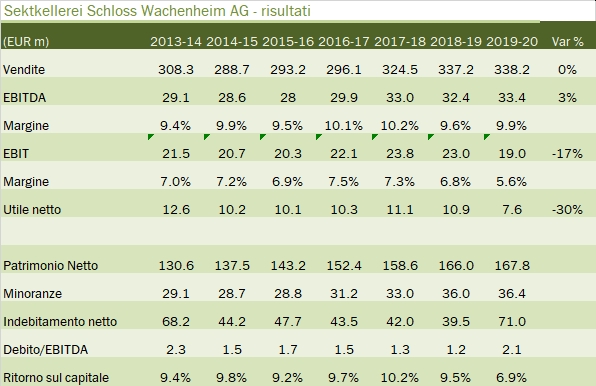 Tra tante aziende che cercano di spostarsi (secondo me correttamente) verso i vini spumanti, SSW rappresenta invece una chiara eccezione: nel corso del 2019/20 l’azienda infatti a completato un paio di acquisizioni in Germania e nell’Est Europa di aziende di produzione di vini fermi, che hanno fatto un ulteriore balzo nel mix delle vendite raggiungendo quota 30% (raddoppiando rispetto a 5 anni fa). Queste acquisizioni hanno poi consentito di mantenere il fatturato stabile intorno a 338 milioni di euro, pur subendo un calo netto nel mercato francese e, escludendo i contributi dell’attività di M&A, anche nel mercato tedesco. Soltanto l’attività in Est Europa mantiene un utile operativo stabile e ora rappresenta oltre il 70% del totale. Ciò che è stato possibile sul fatturato non è stato possibile a livello di utile che invece cala del 30%. Se questo bilancio 2019-20 (chiusura giugno) è stato stabile, il management ha previsto un andamento simile per il 2020-21, a patto che la pandemia non fosse tornata in modo importante (che mi sembra quello che sta succedendo). Bene, con l’avvertenza che dal 2019/20 SSW applica il principio IFRS16 (che rialza l’EBITDA e il debito), passiamo a commentare i numeri.