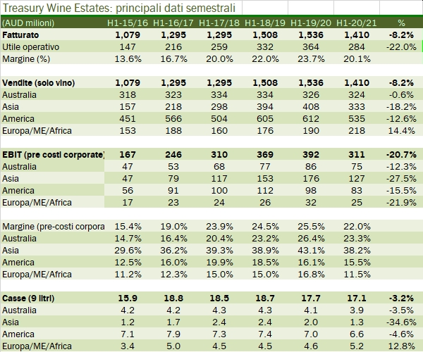 - Le vendite del primo semestre chiuso a dicembre calano dell’8% a 1.4 miliardi di dollari con un calo in tutti i mercati di esportazione e un fatturato di 326 milioni stabile in Australia. Il maggiore calo è in Asia, dove il fatturato scende dell’8% e i volumi del 35%: a fronte di un parziale recupero durante l’estate si è abbattuto sul vino australiano la decisione cinese di applicare dazi pesantissimi (dal 107% al 212% del prezzo di import a partire da dicembre 2020). L’America resta il primo mercato per TWE, con 535 milioni e 6.6 milioni di casse, rispettivamente -12% e -5%.