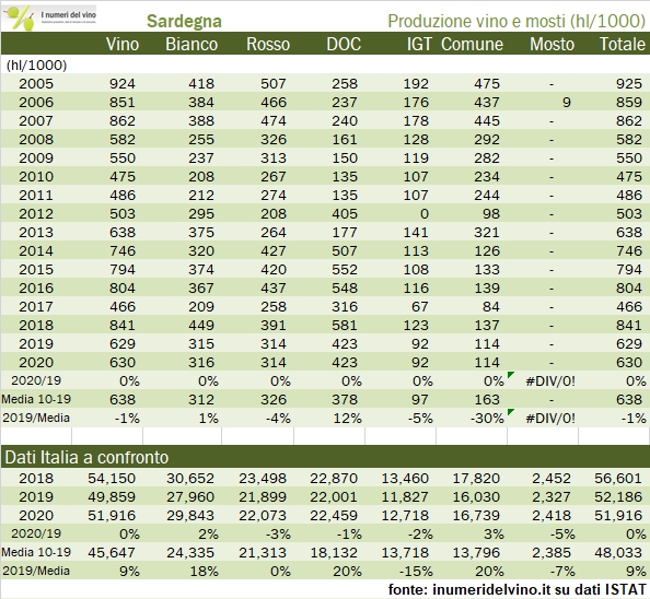 Tornando alla Sardegna i dati di produzione del 2019 e 2020 (dato che sono esattamente uguali, anche qui bisognerebbe chiedere a ISTAT che cosa ne pensa…) puntano su circa 630mila ettolitri di vino, un dato allineato alla media storica, mentre per l’Italia si parla nel 2020 di una vendemmia del 9% superiore alla media storica. Passiamo a commentare qualche dettaglio insieme.