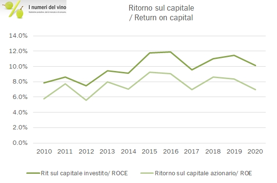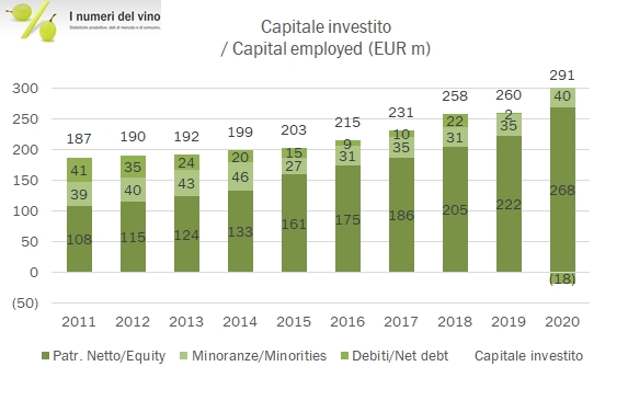 A livello finanziario e patrimoniale ci sono due cose da notare: per prima cosa, la rivalutazione del marchio Frescobaldi per 25 milioni di euro, a fronte del pagamento (nel 2021) di una imposta sostitutiva del 3%. Dopodiché questi 25 milioni di euro saranno ammortizzati per 18 anni, generando uno scudo fiscale al 24%. Il vantaggio sarà significativo (stimo circa 5 milioni di euro spalmato negli anni). Ciò ha determinato un corrispondente incremento del capitale investito, finito nel patrimonio netto. La seconda cosa è relativa al rafforzamento del profilo finanziario. Nel 2020, gli utili sono stati stabili ma gli investimenti sono calati a 10 milioni di euro, il livello più contenuto dal 2013 a questa parte. Pur pagando 5 milioni di euro di dividendi (in leggerissimo incremento sul 2019), il debito di 2 milioni di euro del 2019 si è trasformato in 17 milioni di euro di cassa.