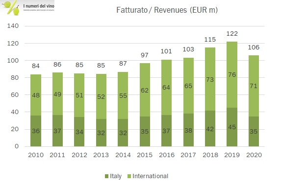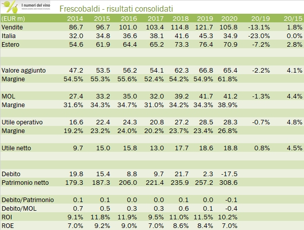 Pur subendo un calo delle vendite del 13% a 106 milioni di euro, più marcato nel mercato italiano, Frescobaldi ha registrato nel 2020 risultati finanziari sostanzialmente stabili rispetto al 2019 (utile operativo di 28 milioni e utile netto di 19), grazie all’attento controllo dei costi. Gli investimenti sono stati concentrati su quelli strategici, amplificando la generazione di cassa, pur in un anno così sfortunato. L’azienda incomincia quindi il 2021 con un saldo di cassa netta di 17 milioni di euro e una previsione di vendite stabili rispetto al 2020. Grafici, tabelle e commento più approfondito nel prosieguo del post.