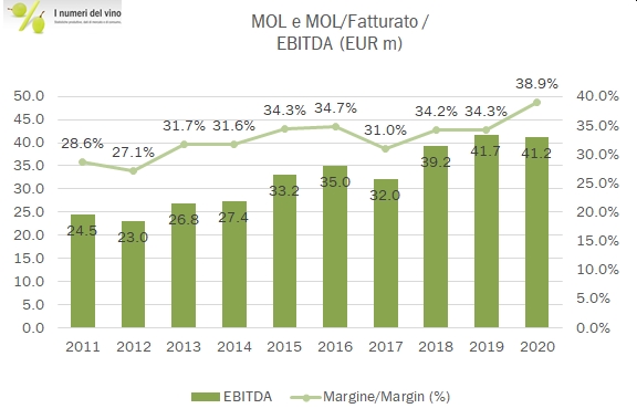 Nell’anno della pandemia Frescobaldi ha mantenuto il primo margine invariato sopra l’80%, stante un’incidenza degli acquisti pari al 18% delle vendite (l’azienda produce perlopiù con materie prime vinicole prodotte internamente). A fronte del fatturato più contenuto l’impatto negativo sul primo margine è stato di circa 3 milioni di euro. Il taglio di costi è stato invece particolarmente marcato nell’ambito dei servizi, scesi da 36 a 24 milioni di euro con una riduzione molto forte delle attività di marketing, pubblicità, consulenze. Ciò ha consentito di risparmiare 12 milioni di euro e di più che compensare l’impatto negativo sui margini derivante dal costo del personale, che è calato soltanto di 1 milione di euro, a 24 milioni. A livello operativo quindi i dati sono stabili rispetto al 2019, 41 milioni di margine operativo lordo e 28 milioni di utile operativo, con un margine sulle vendite che sale di 4 punti percentuali al 39% e 27% rispettivamente.