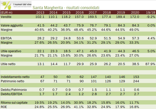 • Passando per chiudere alla parte finanziaria, il debito finanziario netto sale da 146 a 153 milioni di euro dopo aver distribuito 20 milioni di euro di dividendi all’azionista (11 milioni nel 2019). Il patrimonio netto e il capitale investito sono fortemente influenzati dalla rivalutazione e dunque determinano per converso un calo del ritorno sul capitale. Più importante invece è sottolineare come anche in un anno difficile come il 2020 Santa Margherita sia riuscita a generare cassa.