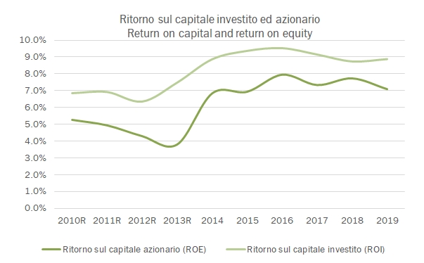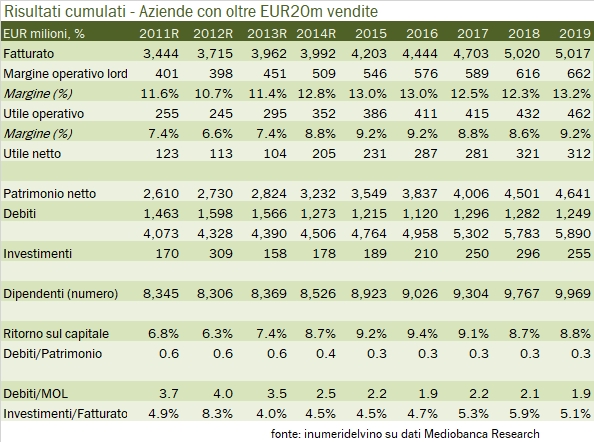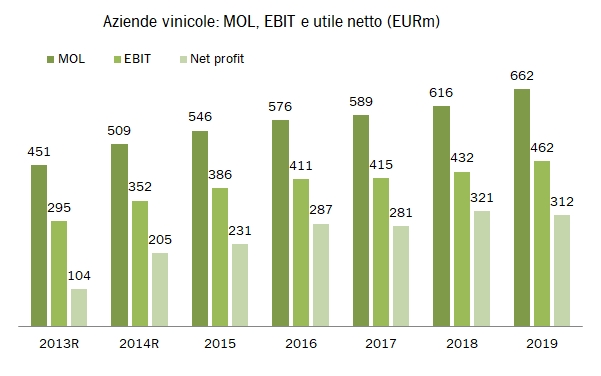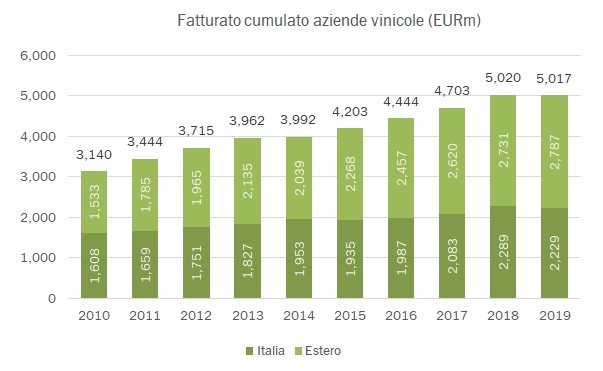 Vi presento oggi I dati 2015-19 (e rettificati quelli degli anni precedenti) relativi alle 143 aziende vinicole italiane escluse le cooperative e le società di proprietà estera, con fatturato di oltre 20 milioni di euro. Il fatturato cumulato del 2019 è pari a 5 miliardi di euro, stabile sul 2018 a fronte di un calo del 2.6% delle vendite italiane e di un incremento del 2% delle esportazioni. Come già abbiamo visto per il campione globale, i margini si sono ripresi dopo il calo del 2017-18, con un margine operativo tornato sopra il 9% per un utile operativo cumulato di 662 milioni di euro, +7%. La struttura finanziaria migliora, grazie a un debito stabile che determina un calo del rapporto sul MOL da 2.1 a 1.9 volte. Tabelle e grafici sono allegati di seguito nel post. Buona consultazione.