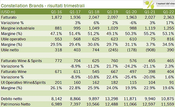 Il 2022 di Constellation Brands si apre con dati allineati alle attese del mercato e previsioni sulla chiusura (Febbraio 2023) invariate rispetto a quanto detto qualche mese fa. La nostra attenzione si rivolte come sempre al segmento del vino, che continua a fare fatica, con vendite stabili nel trimestre dopo due anni di calo e, se arrivate fino in fondo, con alcuni dati sull’aumento dei costi. Come forse avrete letto nei nostri precedenti post, l’azienda ha gradualmente disinvestito nel segmento del vino di media gamma per concentrarsi sui segmenti più premium e più guidati dal marketing. Questo sta portando a uno strutturale calo dei volumi e incremento dei prezzi medi di vendita. Il segmento vino di Constellation proprio in questo primo trimestre non ha più l’impatto dei disinvestimenti e si sta stabilizzando su un fatturato annuale di circa 2 miliardi di dollari con un margine poco superiore al 20% (circa 22% negli ultimi 12 mesi).
