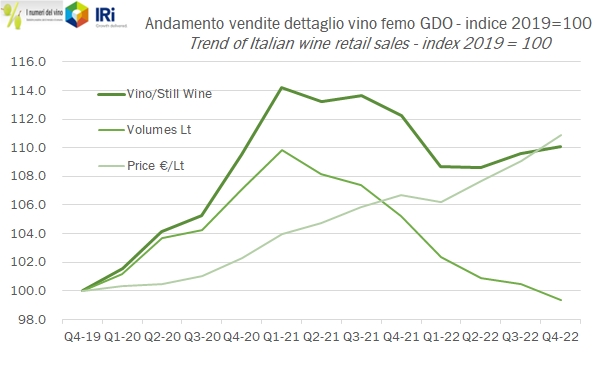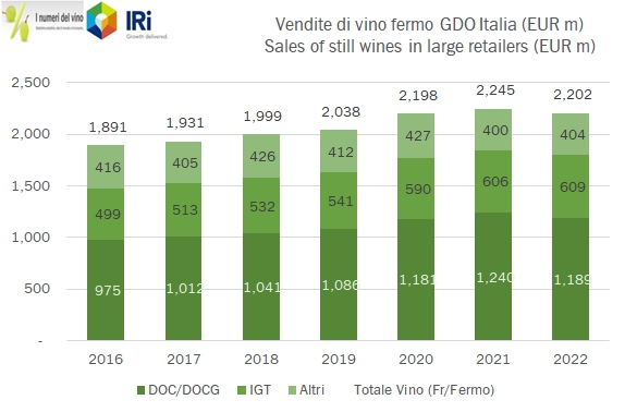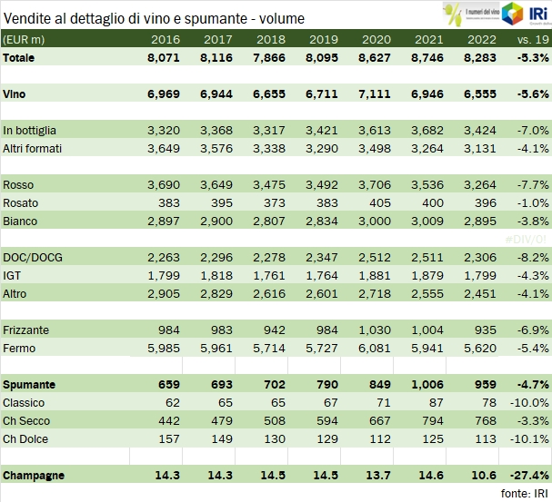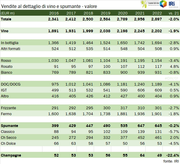 Grazie alla collaborazione con IRI, presentiamo oggi i dati relativi alle vendite di vino del 2022 nella GDO italiana, che nel 2022 sono calate del 2% a 2.9 miliardi di euro, a fronte di un incremento dei prezzi del 3.5% e di un calo dei volumi del 5.3%. Questo -2% è però il saldo di un primo trimestre negativo, un secondo trimestre sostanzialmente stabile e un leggero recupero nella seconda parte dell’anno. In particolare nell’ultimo trimestre le vendite sono cresciute dell’1.4% a fronte di un calo dei volumi del 4% e di un incremento dei prezzi del 5.7%. La principale tendenza in atto è dunque quella dell’aumento dei prezzi, che per tutte le categorie. Il 5.7% a cui abbiamo appena accennato è un dato in parte falsato dal cambio di mix di prodotti acquistati, che si è spostato verso il basso. Se dovessimo guardare all’andamento dei prezzi per singola categoria di prodotto saremmo più intorno al 7-7.5% per i vini fermi e all’8-9% per i vini spumanti. Nei grafici e nelle tabelle potrete dunque vedere come i prodotti meno cari, quindi vini da tavola e IGT stiano da qualche trimestre facendo meglio dei vini DOC, ribaltando una tendenza storica contraria. Bene, fatta questa premessa, vi invito a continuare a leggere, troverete numerosi grafici, tutte le tabelle complete e commenti più dettagliati.