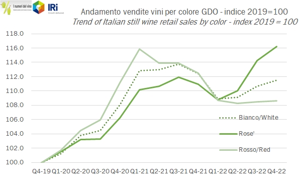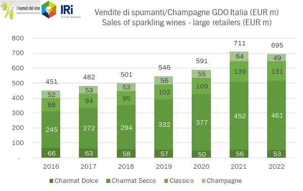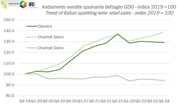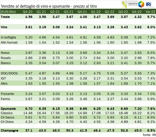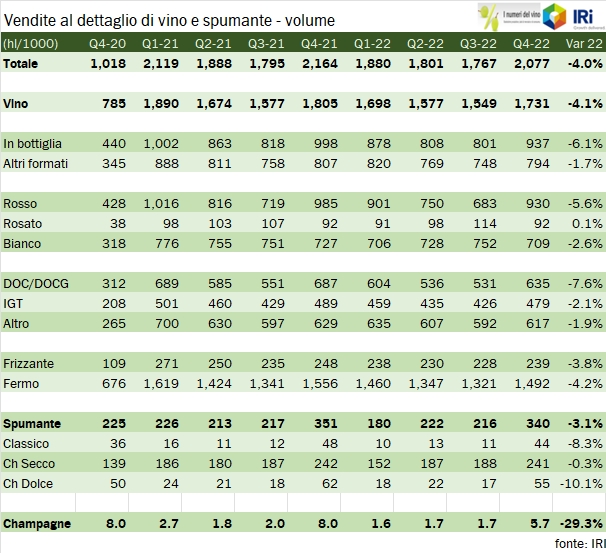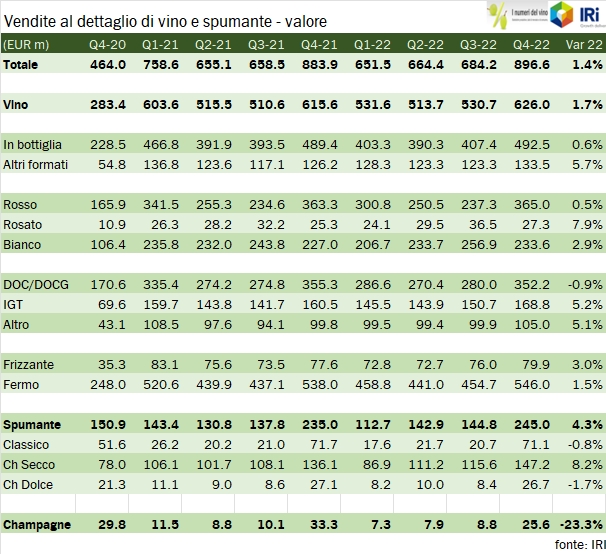- L’ultimo trimestre 2022 è caratterizzato da una ulteriore accentuazione dell’aumento dei prezzi e da un calo dei volumi leggermente meno marcato che nei precedenti periodi. Le vendite di vino fermo sono dunque cresciute dell’1.7% a 626 milioni, quelle di spumante italiano del 4.3% a 245 milioni, mentre sono crollate del 23% le vendite di Champagne, da 33 a 26 milioni di euro.