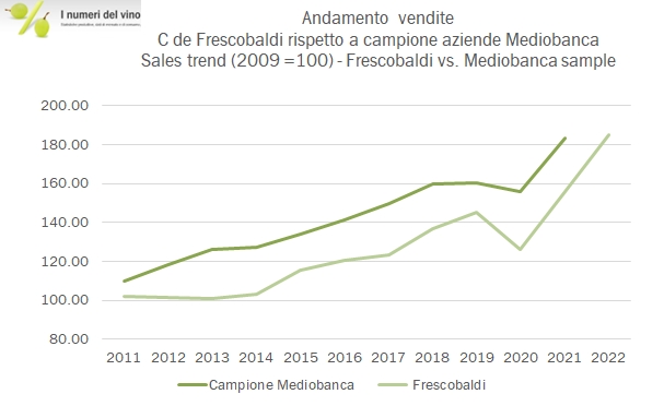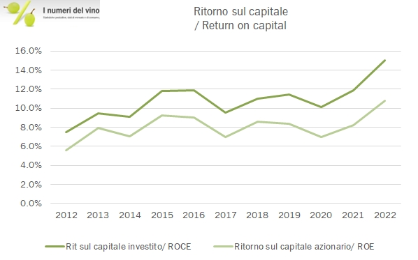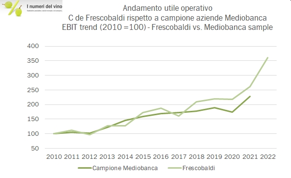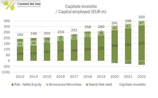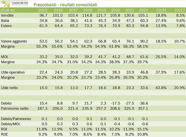 - Il capitale investito sale da 300 a 320 milioni, ma meno degli utili, per cui il ritorno sul capitale investito di Frescobaldi tocca un invidiabile 15% nel 2022.
