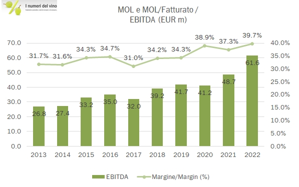 Nel 2022 Frescobaldi ha toccato quota 155 milioni di euro di fatturato (+19%) ma ha soprattutto raggiunto i margini più alti della sua storia con un rapporto EBITDA su fatturato del 40% e utile operativo su fatturato del 30%. Il ciclo di investimenti è ripreso dopo lo stop del Covid, con ben 27 milioni di investimenti (17% delle vendite) e qualche acquisizione “di contorno”, ma ciò non ha impedito di migliorare ulteriormente la posizione finanziaria, che a fine 2022 raggiunge una cassa netta di 37 milioni di euro. In particolare, Frescobaldi ha investito circa 10 milioni di euro per espandere la superficie vitata. Le previsioni contenute nel bilancio per il 2023 sono molto succinte, ma contengono comunque un messaggio positivo (“Nonostante l’incertezza presente e futura sull’evoluzione del contesto economico globale, per il momento l’attività del Gruppo prosegue senza particolari problemi da segnalare”). Nel 2023 vedremo l’impatto dell’acquisizione della Tenuta Calimaia nel territorio di Montepulciano, con 70 ettari di vite, di cui non si conosce ancora il prezzo (lo sapremo tra un anno…). Passiamo all’analisi dei dati.