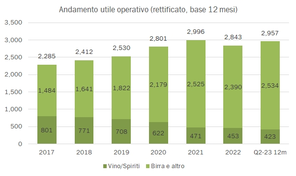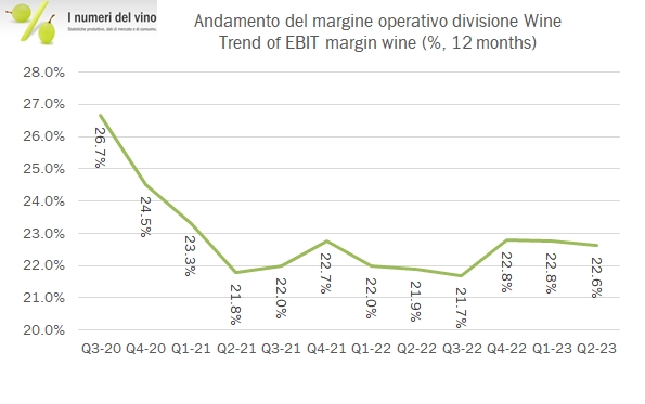 - A livello operativo i margini sono in crescita ma, di nuovo, tutto è legato alla birra. Nel segmento vino e spiriti (riportati insieme) l’utile operativo trimestrale cala del 19% a 81 milioni, per un margine del 18% rispetto al 19% dello scorso anno. Sui 12 mesi terminanti a fine agosto, come vi indica il grafico il margine è del 22.6% non distante da dove stava un anno fa. Si tratta di un risultato non eccellente ma va considerato anche il calo delle vendite e il minore assorbimento dei costi fissi.