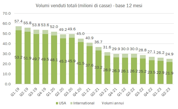 - I volumi di vino scendono a 6.1 milioni di casse nel trimestre e 25 milioni sui 12 mesi, ormai molto distanti dai 70 milioni di casse che CBrands esprimeva nel 2016.