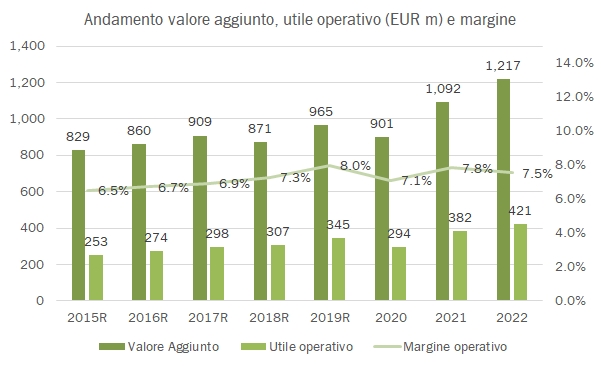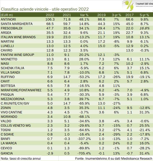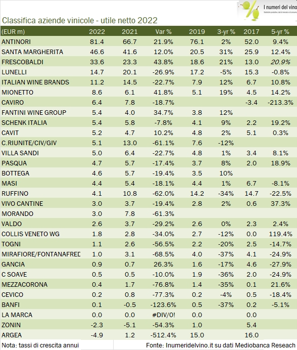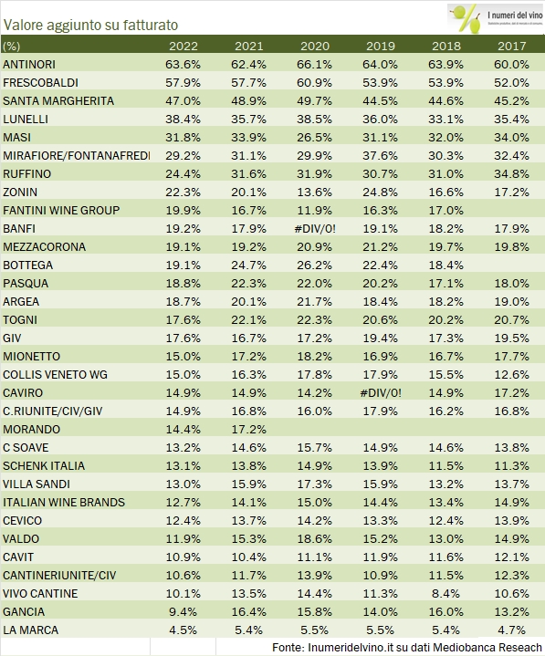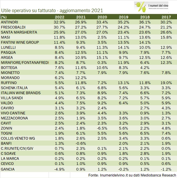 - Se guardiamo ai margini, le aziende più verticalmente integrate ovviamente hanno i risultati migliori. Antinori guida con un valore aggiunto su vendite del 64% e un margine operativo del 33%, entrambi superiori al 2021 quando le rivalutazioni e l’impatto COVID (validi entrambi un po’ per tutti) avevamo determinato una diluuzione. Seguono Frescobaldi e Santa Margherita, con un margine operativo del 31% e 26% rispettivamente, poi si scende all’11% di Masi e qui troviamo tutti gli altri.