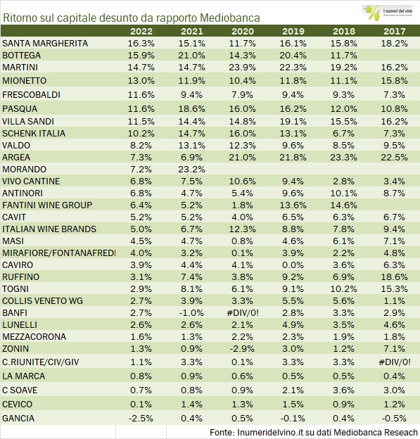 - Dal punto del ritorno sul capitale investito, non è più Antinori a guidare la classifica ma bensì Santa Margherita, che combina una forza commerciale importante con un livello di integrazione verticale inferiore, il che limita l’ammontare del capitale investito. Il suo ritorno sul capitale, salvo il 2020 è stato nell’intorno del 16-18% negli ultimi anni. Su un livello simile troviamo Bottega, che però ha dei numeri in valore assoluto piuttosto esigui. Ad ogni modo, nel 2022 è riuscita a generare 6.5 milioni di utile operativo con 41 milioni di capitale investito e quindi sta intorno al 16%. In doppia cifra in termini di capitale investito troviamo poi Mionetto, Frescobaldi, Pasqua, Villa Sandi e Schenk Italia.