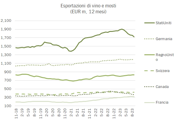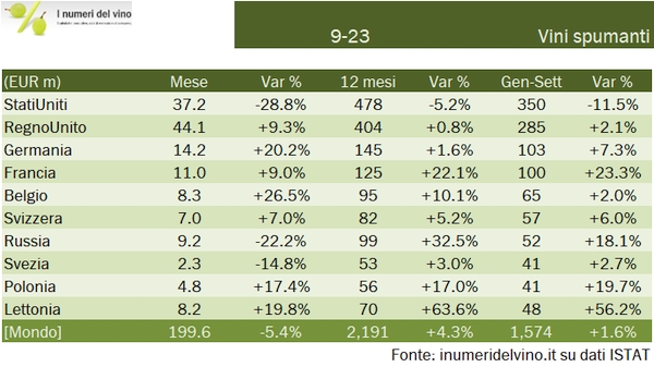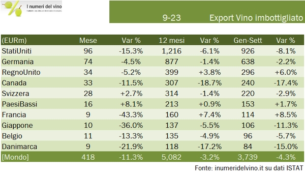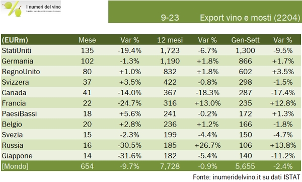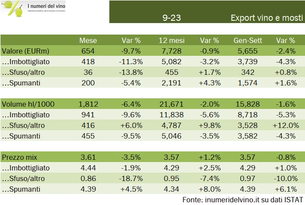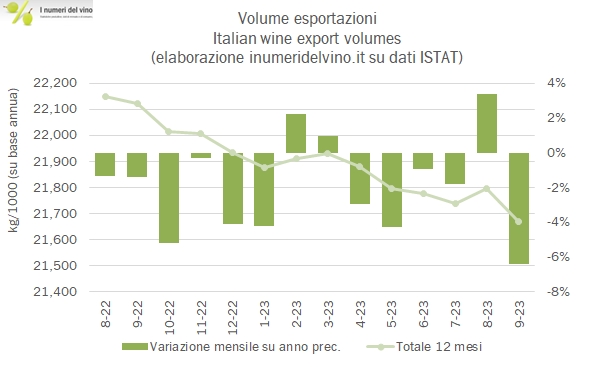 • Settembre è stato il peggior mese del 2023 per le esportazioni, con un calo del 9.7% a 654 milioni di euro, determinato da una riduzione del 6.4% del volume a 1.8 milioni di ettolitri. Con questi dati il saldo dei 9 mesi tocca 5.65 miliardi per un calo del 2.4%. Sugli ultimi 12 mesi, ossia considerando un dato stabile sugli ultimi 3 mesi saremmo a -0.9% per 7.73 miliardi di euro.