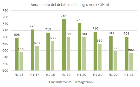 • A livello finanziario, pur non pagando dividendi, il debito non è sceso “di anno in anno”, quindi giugno contro giugno e resta sui 700 milioni. Il magazzino scende leggermente e quindi i rapporti di indebitamento restano piuttosto elevati (anche se in miglioramento in rapporto agli utili), a 1.7 volte debito su patrimonio (da 1.9) , 1.1 volte debito su magazzino (stabile) e 12 volte l’EBITDA degli ultimi 12 mesi (contro 14x).
