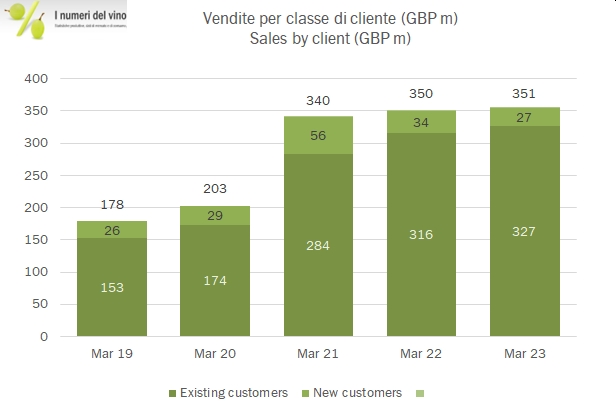 - Le vendite sono state sostanzialmente stabili nel 2022-23 a 350 milioni più 3 milioni di altre vendite non ricorrenti, per un totale di 354 riportato. I clienti esistenti hanno fatto +3% comprese le altre vendite, ma sarebbero stati stabili altrimenti, il fatturato da nuovi clienti è calato del 20%.