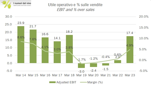 - Il miglioramento dei risultati “aggiustati” è essenzialmente legato al minore investimento nei nuovi clienti, che ovviamente genera perdite: erano 41 milioni nel 2021-22, sono 21 milioni nel 2022-23, e questo più che giustifica il miglioramento dell’utile operativo aggiustato da 2 a 17 milioni di euro. I costi generali sono saliti da 43 a 48 milioni e quindi hanno un impatto negativo, il margine di contribuzione dai clienti esistenti è stabile. Dai 17 milioni di utile operativo aggiusto ai 14 di perdita operativa riportata ballano come dicevamo 14 milioni di svalutazione del magazzino americano e 18 milioni di cancellazione di avviamento, entrambe “non cash” quindi senza implicazioni sulla cassa… ma si tratta di attività che scompaiono.