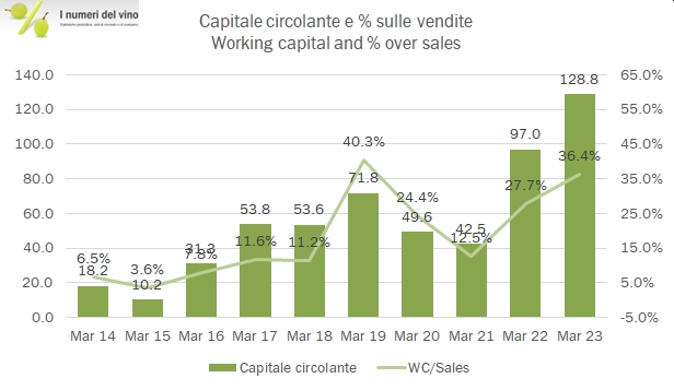 - La parte finanziaria è fortemente influenzata dal capitale circolante, dato che l’azienda non ha rilevanti investimenti (2 milioni). La cassa netta scende da 40 a 10 milioni, con un peggioramento del capitale circolante di oltre 30 milioni.