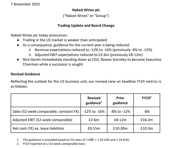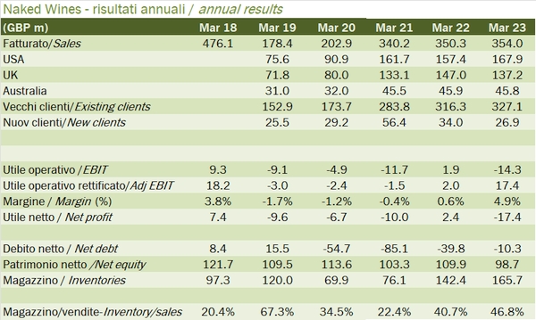 Sono in notevole ritardo on Naked Wines perchè il bilancio 2022-23 è stato rimandato ma soprattutto perché a novembre la società ha comunicato un forte peggioramento dell’attività, relativo taglio delle stime relative al 2023-24. Tutto ciò ha determinato la defenestrazione del CEO, sostituito dal fondatore e presidente dell’azienda. Già il bilancio che analizziamo oggi aveva mostrato delle crepe significative: vendite stagnanti a circa 350 milioni di sterline, forte rallentamento della crescita dei clienti esistenti (+3% contro +11% dell’anno scorso), minore investimento nell’arruolamento di nuovi clienti, significativo deterioramento del capitale circolante (aumento del magazzino) e svalutazione dell’avviamento e di parte del magazzino per circa 32 milioni di sterline. I risultati finali possono essere visti “come riportati”, con una perdita operativa di 14 milioni e una perdita netta di 17, oppure come “aggiustati” senza le partite straordinarie il che vedrebbe un utile operativo di 17 milioni contro i 2 dello scorso anno. La posizione finanziaria netta mette tutti d’accordo: la cassa scende da 40 a 10 milioni. Ma soprattutto mette tutti d’accordo l’annuncio scioccante di novembre (estratto in immagine nel post), che ha fatto saltare le carte in tavola nel consiglio di amministrazione: vendite previste in calo del 12-16% nel 2023-24 (rispetto a -8/12% precedente), con un -17% nel primo semestre chiuso a settembre, utile operativo aggiustato di 2-6 milioni rispetto a 8-12 precedente (e 17 dell’anno che commentiamo), cassa tra 0 e 15 milioni da 10-30 di prima e rispetto a 10 del 2022-23. Azioni colate a picco, l’azienda vale 26 milioni di sterline… quasi niente… qualche ulteriore commento nel resto del post.