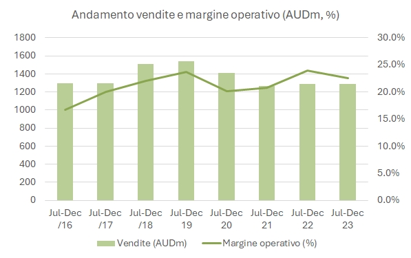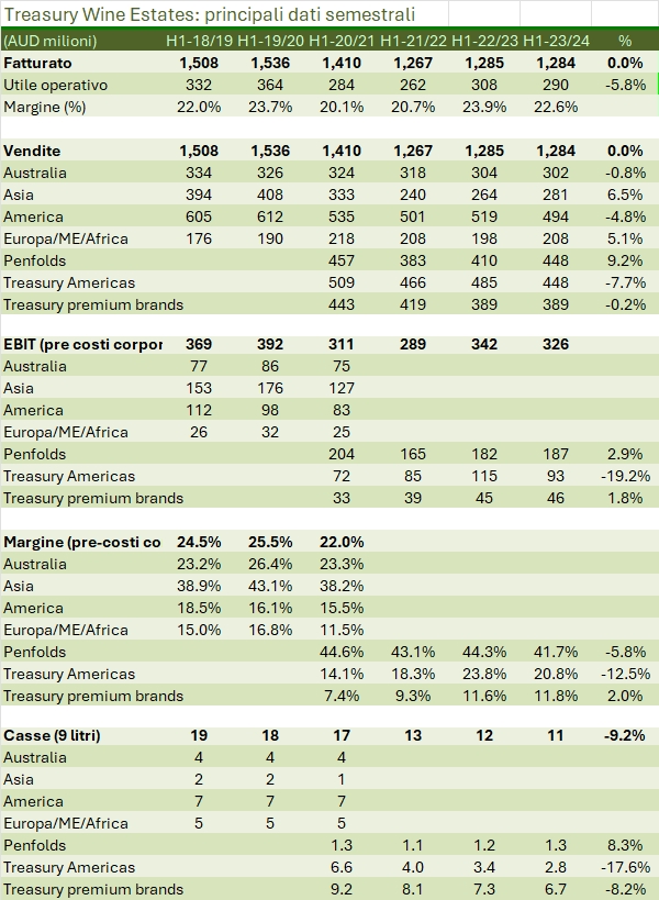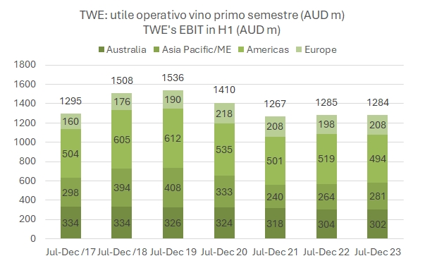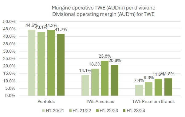 Se c’è una grande azienda nel mondo che ha nel vino il suo vero “core business”, probabilmente questa è TWE. Con un’operazione piuttosto aggressiva ha annunciato alla fine del 2023 l’acquisizione per 1.5 miliardi di dollari australiani di DAOU (di cui 0.5 miliardi finanziati con debito e 1 miliardo con nuove azioni), un’azienda americana principalmente attiva nel segmento “luxury” e in rapida crescita. Si tratta di 1.1 milioni di casse di vino, nella fascia di prezzo tra 20 e 40 dollari americani, con 220 milioni di dollari USA di vendite e 63 milioni di dollari USA di utile operativo (che diventano quindi circa 100 in dollari australiani, ossia il 19% circa dell’utile operativo di TWE dell’anno scorso). Con l’operazione, valutata 13 volte l’EBITDA prima delle sinergie (circa 9 volte comprese), TWE si prende la leadership nel segmento del vino sopra 20 dollari in USA, con l’11% di quota circa (il secondo ha l’8%). Ma le novità, prima di passare all’analisi dei dati semestrali, non si fermano qui: tra marzo e giugno ci si aspetta che la Cina possa rivedere le tariffe proibitive applicate al vino australiano: se fossero abbassate, si riaprirebbe un mercato chiave per TWE, particolarmente per Penfolds, il marchio di lusso (che oltretutto ha cominciato a produrre Champagne in collaborazione con Thienot).