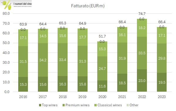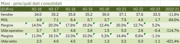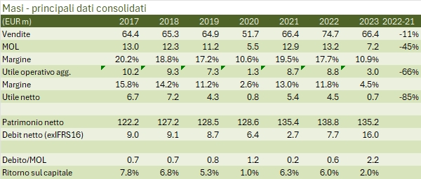 Il 2023 è stato un anno particolarmente difficile per Masi dal punto di vista economico: i dati, anche a causa di un confronto particolarmente difficile con l’ottimo 2022 sono in calo significativo, tanto da arrivare a un utile netto di meno di un milione di euro, mai sperimentato se non nell’anno del Covid. Non è tutto negativo però: la famiglia Boscaini ha fatto la pace con la famiglia Rosso e ha riacquistato le sue quote (ora la famiglia e ENPAIA detengono il 91% del capitale… perché restare quotati in borsa?), sono ripresi i lavori della nuova cantina di Monteleone ed è stata messa a segno l’acquisizione di una cantina in Oltrepo’ Pavese (Casa Re). Non ultimo, Masi ha introdotto una nuova bottiglia più leggera (tema che mi sta particolarmente a cuore). Tornando ai dati 2023, le difficoltà sui mercati esteri, la scarsa vendemmia 2023, la perdita di significativi contributi OGM e l’inflazione sui costi operativi (nonostante aumenti di prezzo applicati superiori al 10% in alcuni casi) hanno tutti contribuito a un calo delle vendite del dell’11% a 66.4 milioni (lo stesso livello del 2021 e del pre-Covid), un crollo dell’utile operativo passato da 9 a 3 milioni di euro (-66%) e un utile netto di 0.7 milioni di euro (4.5 nel 2022), come dicevamo mai visto così basso. Non ultimo nel 2023 l’indebitamento raddoppia da 8 a 16 milioni di euro. Dividendo 2023 dimezzato. Apertura del 2024 sulla stessa china della fine del 2023 (quindi male). Ulteriori commenti, grafici e tabelle nel resto del post per chi è interessato.