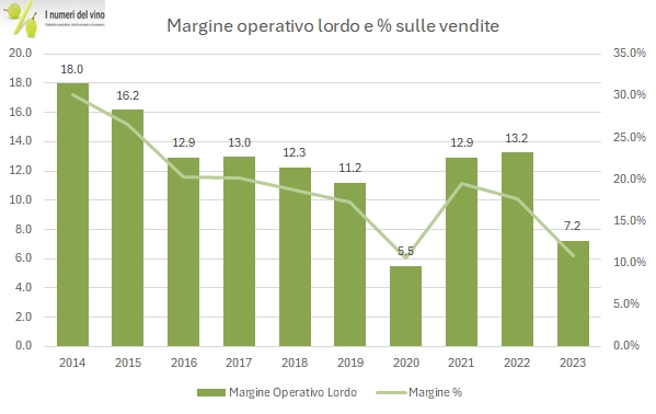 - A livello operativo il margine industriale si mantiene stabile al 60% (grazie agli aumenti di prezzo) e scende in valore assoluto da 45 a 40 milioni. Sebbene i costi per servizio calino, la mancanza dei contributi OCM si fa sentire e contribuisce al crollo dell’utile operativo da 8.8 a 3 milioni di euro.
