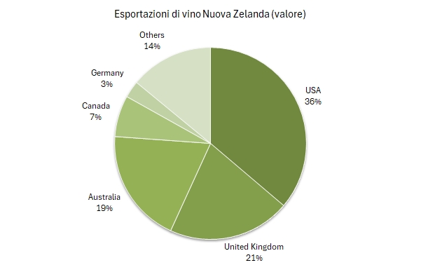 - Se guardiamo ai principali mercati, gli USA calano dell’8% a 810 milioni di dollari NZ (con volumi scesi dell’11% a 971 mila ettolitri) e il Regno Unito cala del 6% a 469 milioni di NZD, per un volume sceso dell’8% a 664 milioni di euro. A chiudere il mondo anglosassone ci sono però i dati estremamente negativi del Canada, crollato del 17% in volume e del 21% in valore a 133 milioni. Resta pur sempre il quarto mercato, preceduto dall’Australia dove le cose sono andate in modo simile, con un -21% a 371 milioni di NZD per un volume in calo del 19% a 568mila ettolitri,.