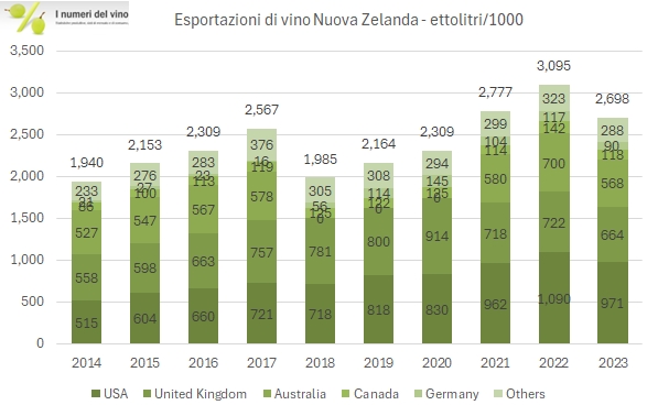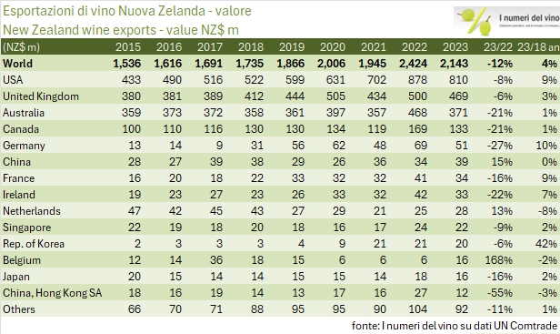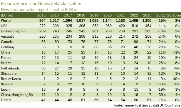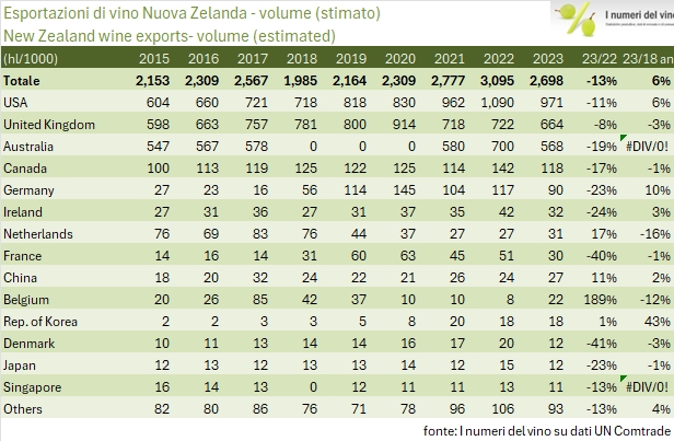 - Passando ai volumi, il calo del 13% a 2.69 milioni di ettolitri lascia comunque la Nuova Zelanda come il paese in più forte crescita nel panorama mondiale, +6% annuo dal 2018 al 2023.