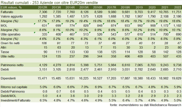 Grazie alla cortesia degli esperti dell’Area Studi Mediobanca possiamo anche quest’anno analizzare il prezioso rapporto sul settore del vino (disponibile a questo link), con l’aggiornamento dei dati cumulati di 253 aziende vinicole che rappresentano il l’88% circa del comparto. I dati sono un anno in ritardo per via della disponibilità dei bilanci, e fanno quindi riferimento al 2022. Il quadro dell’anno è chiaro: recupero totale delle vendite perse nel periodo COVID (+9%), ma un forte impatto sui costi produttivi per via della fiammata inflazionistica che ha determinato una diluizione dei margini e, alla fine, utili inferiori al 2021 (solo marginalmente a livello operativo). Con investimenti quasi stabili in proporzione alle vendite (5%) e un indebitamento cumulato stabile, il rapporto debito/EBITDA è rimasto a circa 2.3 volte, il livello più basso da quando seguiamo il rapporto, a significare che le aziende vinicole italiane hanno spazio per investire (e Antinori, per esempio ma non solo, lo ha fatto con un sostanzioso investimento in USA). Il 2023 sarà un anno di transizione con vendite stabili (secondo il sondaggio di Mediobanca, che applica a una buona quota delle aziende) e, presumibilmente, costi che tornano sotto controllo. Mettendo tutto insieme, difficilmente il 2023 potrà mostrare significativi progressi. Proseguiamo l’analisi nel resto del post con numerosi grafici e dati riassuntivi.