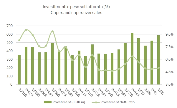 - Infine, gli investimenti sono stati 586 milioni di euro, in crescita del 12% rispetto al 2021, a fronte di un fatturato cresciuto come dicevamo del 9% e di un MOL a +4%.