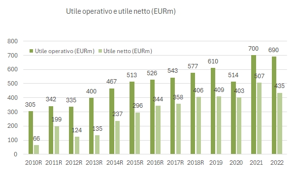 - I maggiori tassi di interesse hanno determinato un forte incremento degli oneri finanziari (+21%), nonostante il debito sia rimasto praticamente stabile (2.7 miliardi di euro) e a completare il quadro la tassazione è leggermente cresciuta (dal 21.5% al 22%), come i componenti non ordinari. Alla fine dei conti, l’utile netto cala da 507 a 434 milioni, anche se va detto che il confronto era con un 2021 “eccezionale”.