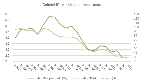 - A livello finanziario e patrimoniale, il capitale investito cresce da 11.9 a 12.45 miliardi di euro (nonostante un miglioramento della gestione del circolante), con un debito stabile a 2.7 miliardi. Il rapporto con il patrimonio netto migliora, mentre quello con il MOL resta stabile a 2.3 volte, il livello più basso di sempre.