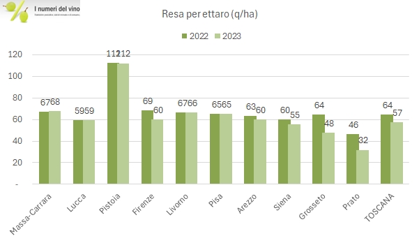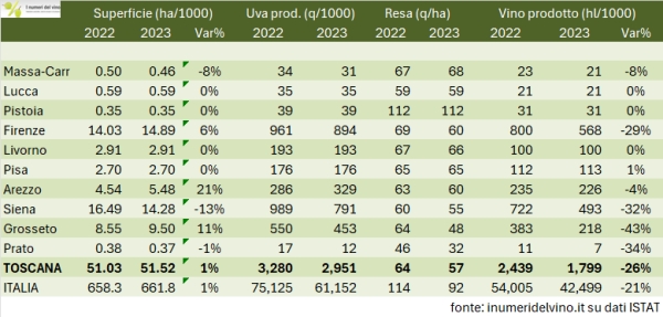 - Secondo ISTAT la superficie vitata in Toscana è cresciuta di 500 ettari a 51520. Tralascio i commenti sulle province visto che i dati mostrano delle variazioni sul 2022 che sono inverosimili.
