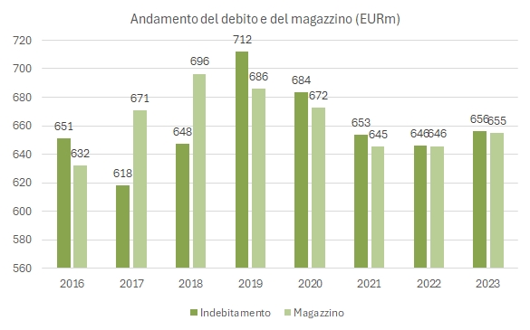 - I margini sono migliorati e sono al massimo da molti anni a questa parte anche in prospettiva storica. Nel 2023 l’EBITDA tocca quota 54 milioni, +11% e con un margine del 16%, mentre l’utile operativo cresce del 15% a 39 milioni, con un margine dell’11.6%, il più elevato dal 2007 a questa parte. A livello di utile netto i dati sono molto meno positivi a causa dell’incremento pesante degli oneri finanziari, da 18 a 29 milioni di euro che si mangia completamente l’incremento di 5 milioni di euro a livello operativo per determinare un calo dell’utile netto da 10 a 6 milioni di euro. Nonostante questo l’azienda ha mantenuto anche per il 2024 la previsione di pagare 7 milioni di dividendi, come gli anni scorsi.