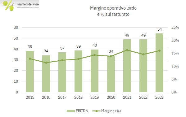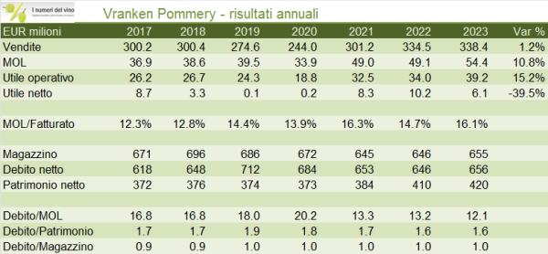 Come abbiamo già commentato guardando I risultati di LVMH e di Lanson, anche Vranken ha avuto un 2023 quasi a “due facce”, con una prima parte dell’anno ancora positiva, soprattutto nell’evoluzione dei margini e una seconda parte dell’anno in leggerissimo calo di vendite e con un margine sostanzialmente allineato a quello degli anni scorsi. Alla fine dei conti, nonostante l’aumento del debito (circa 10 milioni) è allineato all’aumento del magazzino (9 milioni), l’azienda non è riuscita a generare cassa sufficiente anche per pagare i dividendi agli azionisti, rimasti stabili a 7 milioni di euro. Come sempre, la relazione degli amministratori è avara di dettagli aziendali (mentre ci sono ricchissime informazioni sul mercato…) e nulla dice sulle prospettive dell’azienda per il 2024. Passiamo a una breve analisi dei principali dati contabili.